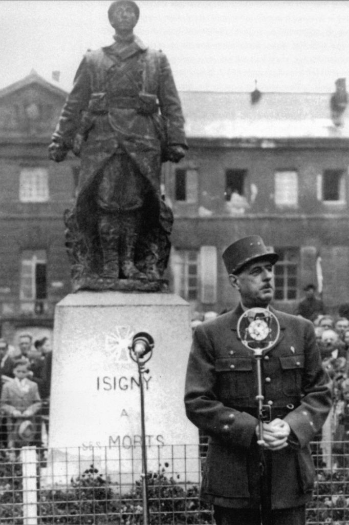 Après plusieurs années d’exil en Grande Bretagne d’où il pilote la position et les engagements de la France Libre, le Général de Gaulle pose le pied sur le sol de France en débarquant de La Combattante le 14 juin 1944 soit 8 jours après le début des opérations de débarquement en Normandie. Il quitte directement Courseulles-sur-Mer pour donner un premier discours à Bayeux. Les Français découvrent ainsi sa silhouette imposante pour la toute première fois. Puis, il quitte Bayeux pour visiter Isigny-sur-Mer, ville avec laquelle il tissera un profond lien d’amitié et prononcera à la population émue :