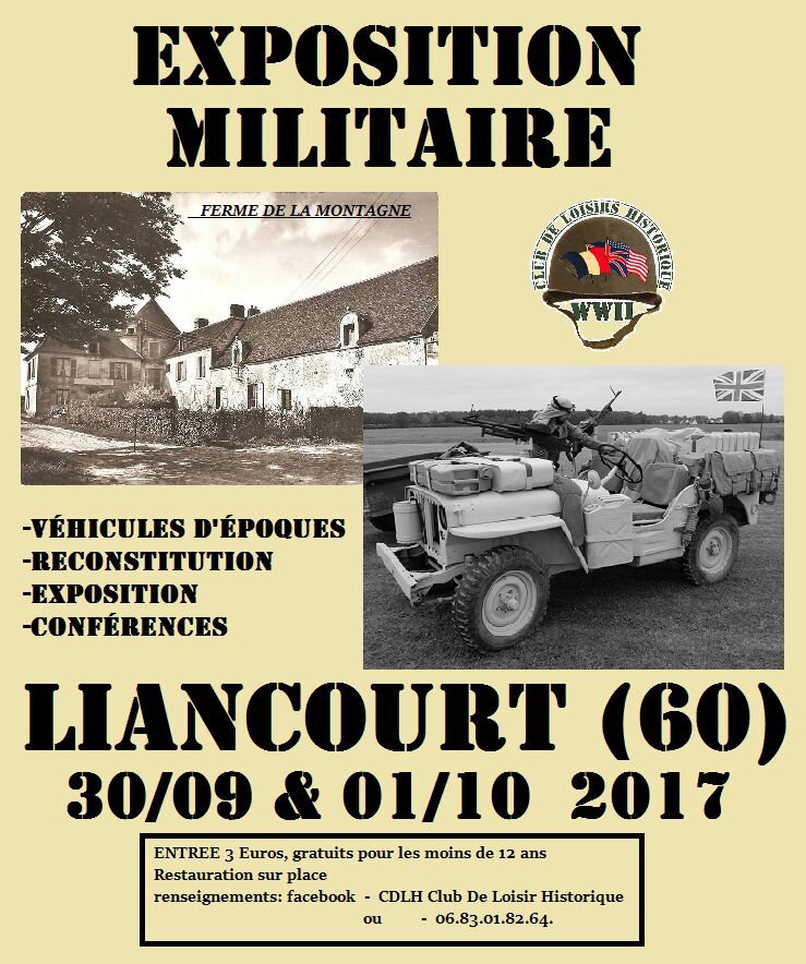Exposition temporaire avec véhicules militaires, matériel d’époque,conférences et reconstitutions à Liancourt (60) à la Ferme de la Montagne encore appelée Centre historique des Arts et Métiers de Liancourt.